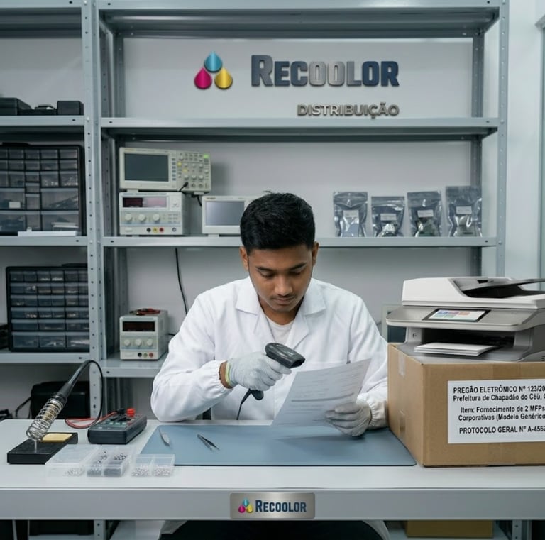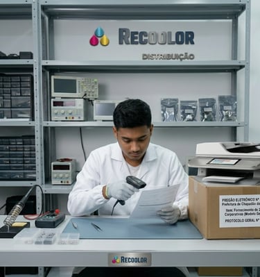 Equipamentos, suprimentos e ambientes de impressão que refletem a estrutura técnica e a variedade de soluções da Recolor.